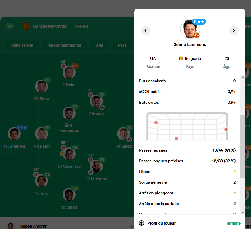 Alexis.B Posté(e) il y a 2 heures Partager Posté(e) il y a 2 heures Lammens aura quand même fait une bonne première. Il a géré les quelques situations chaudes. Il a aidé par trois fois dans les airs quand on aurait sûrement galèrer avec Bayindir. Même aux pieds c'était pas dégueulasse finalement, il a plusieurs fois bien aidé sa défense en donnant une solution derrière. Et surtout, je l'ai vu gueuler sur ses gars devant lui, notamment sur l'action qu'il sort à la fin. CS. Parfait. Yoro qui fait un bon match, tout comme De Ligt. Shaw un peu moins à mon goût. Dalot - Amad. Un sans cerveau d'un côté avec Mount qui a du cerveau. Et un mec qui a posé le cerveau avec Mbeumo qui a du cerveau. Ben du coup ça te donne une animation moins déséquilibrée que la semaine dernière. Casemiro aura fait un bon match, si on enlève son carton complètement stupide une fois de plus. Bruno aura été INVISIBLE. Une partition digne de Mister Fantastique (pour ceux qui ont la ref). Devant Mount prouve qu'il est devant Cunha quand il joue à ce niveau, vraiment. Ça pue le QI foot, et franchement, ça fait plaisir. Le voir sans arrêt, en phase défensive, regarder derrière lui, le placement de Shaw et Dalot, pour ne pas briser la structure tactique, waouh, gros boulot. Mbeumo, ouais, dur ce match. Les contrôles orientés sont un délice. La finition est un kinder délice. Voilà. Sesko, enfin il est impliqué. Le nombre de protection de balle qui lui permet de lancer Amad, Mbeumo, ou encore Cunha en fin de match, c'est précieux. Les entrants, Mainoo fait plutôt bien pour son temps réduit. Cunha, on sent que le poids du transfert est giga lourd. Il a besoin de débloquer le compteur, parce que ça lève pas la tête. Dorgu très bien, dans son registre habituel. Il aurait sûrement dû marquer même, plutôt que faire la passe. Pour Ugarte et Maguire, ma foi, y a rien à juger. 5 Lien vers le commentaire Partager sur d’autres sites More sharing options...